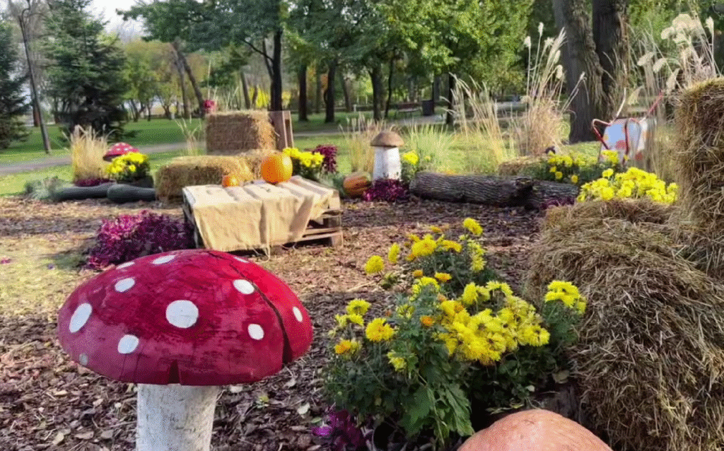 Один із найпопулярніших парків Оболоні став центром осінньої фотомагії. Тут облаштували масштабну фотозону з тюків сіна, гарбузів, хризантем і великих декоративних грибів — ідеальне місце для родинних фото.