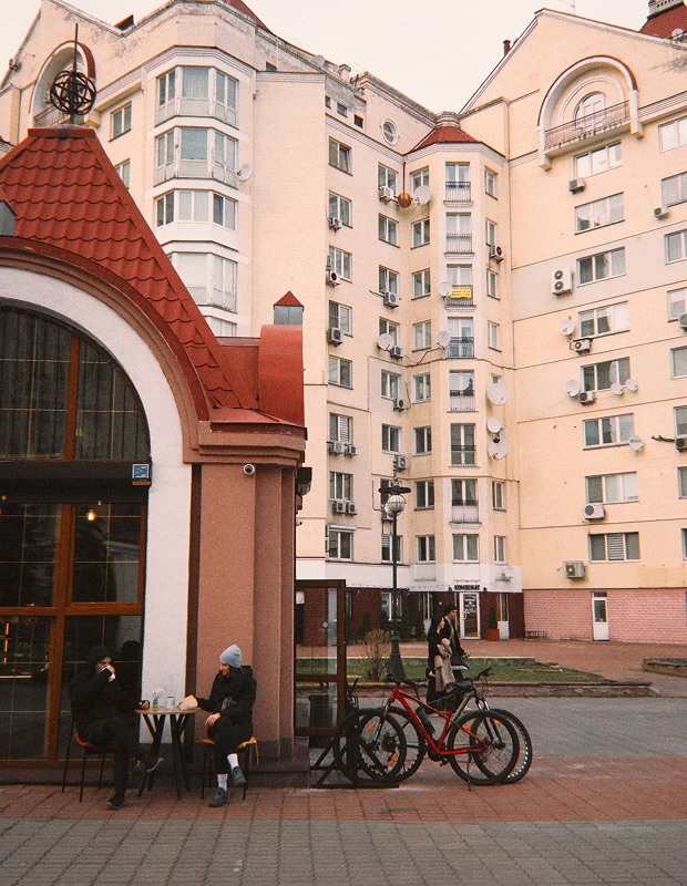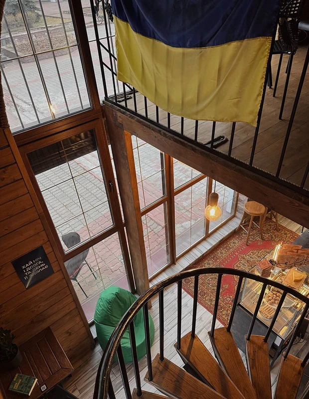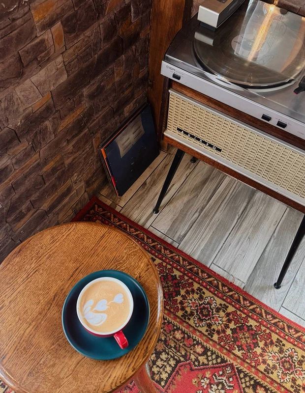 Інтерʼєр кавʼярні збирали буквально «по частинах»: шукали речі на барахолках, в інтернеті та навіть у родичів. Серед деталей — старий велосипед «Турист» на стіні, вініловий програвач із платівками та автентичний килим.