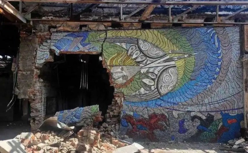 Оригінальна мозаїка, що зображує сокола в польоті, була створена влітку 1967 року та стала символом свободи. Зараз вона перебуває за будівельним парканом у Маріуполі, а її точний стан невідомий.